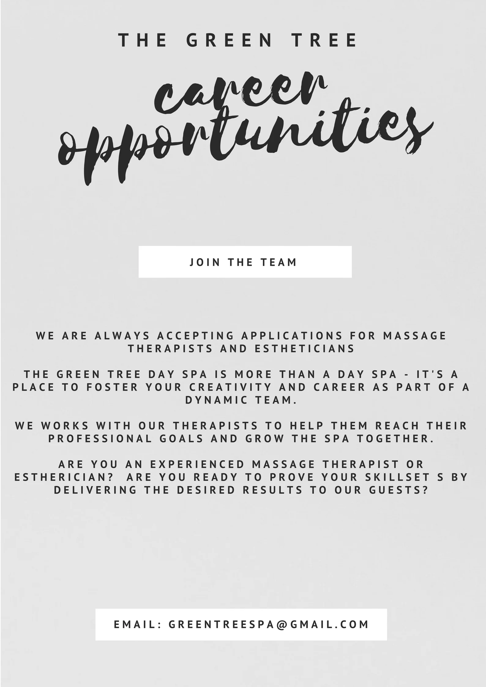 Send all inquiries and resumes to GreenTreeSpa@gmail.com