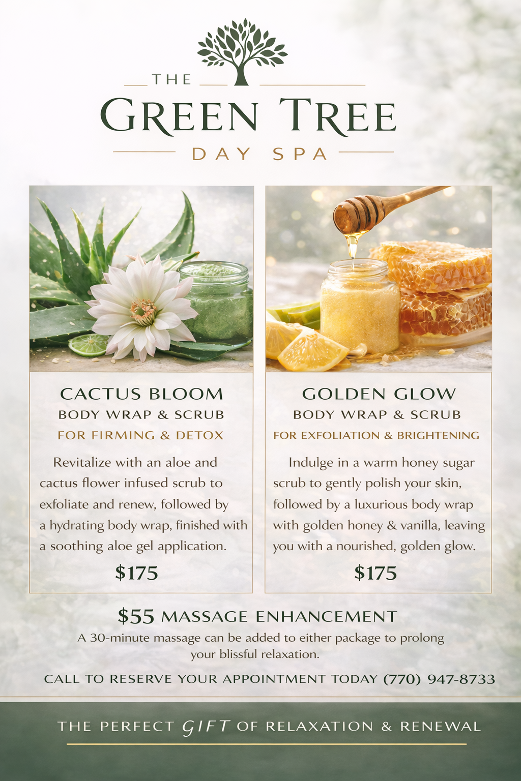 These seasonal specials are available for a limited time, so now is the perfect moment to purchase a gift card and plan your next spa day. Gift cards are valid for 3 years from the date of purchase. Purchase online for a printable certificate - they can also be scheduled to send at a certain date! Or, visit us in store at The Green Tree Day Spa for special gift packaging. Give the gift of relaxation today.